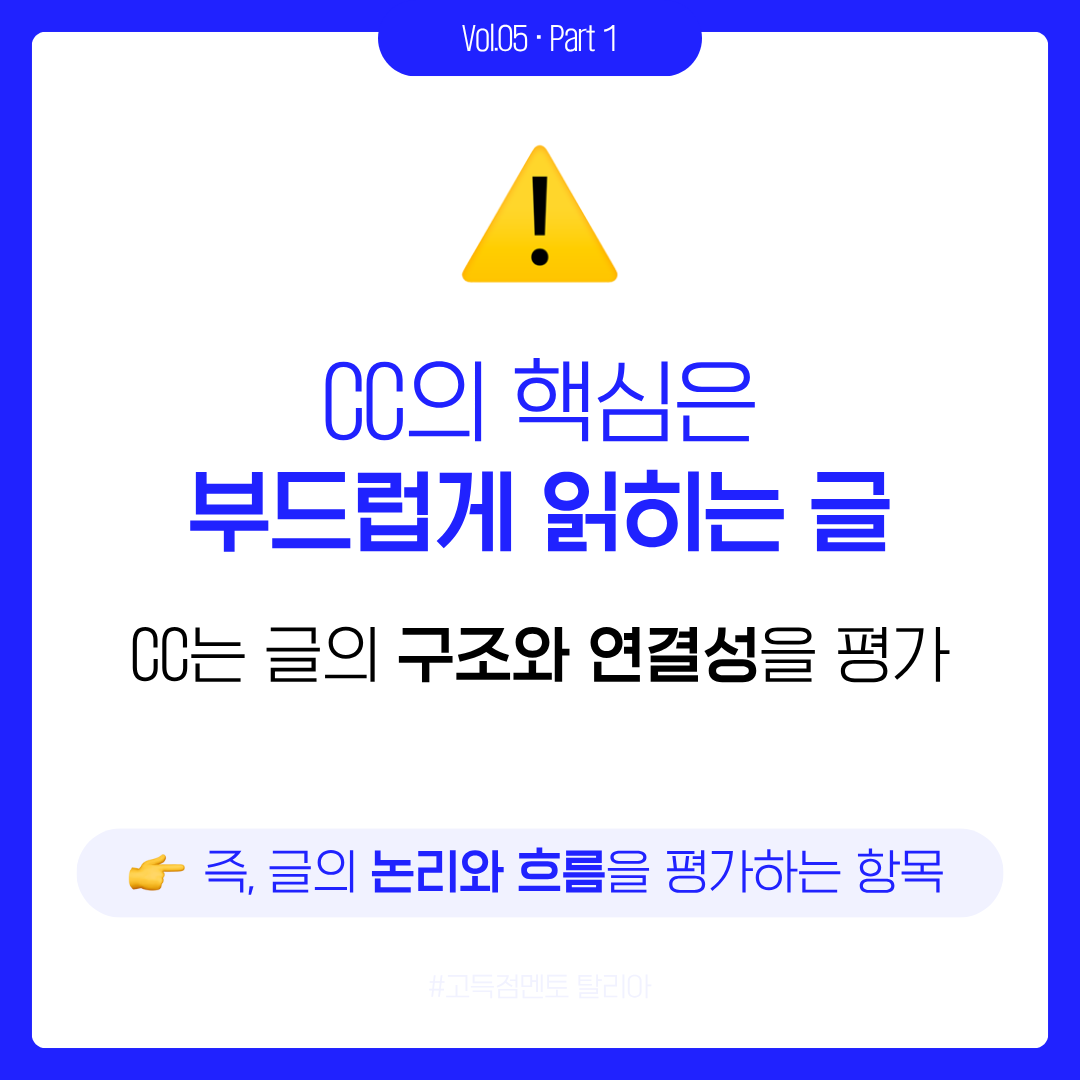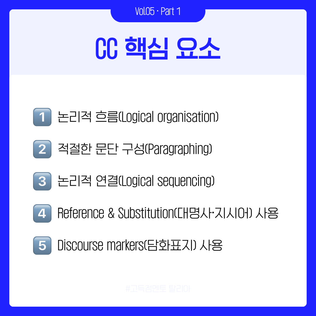 공식 기준에서 CC는 단순히 "접속사 많이 쓰기"가 아니라, 문단 구성, 논리적 순서, 대명사와 담화표지의 자연스러운 활용까지 포함합니다. 이번 편을 통해 "글이 논리적으로 흘러간다"는 것이 어떤 의미인지, 그리고 그 차이가 점수를 어떻게 결정하는지 명확하게 느끼실 수 있길 바랍니다.