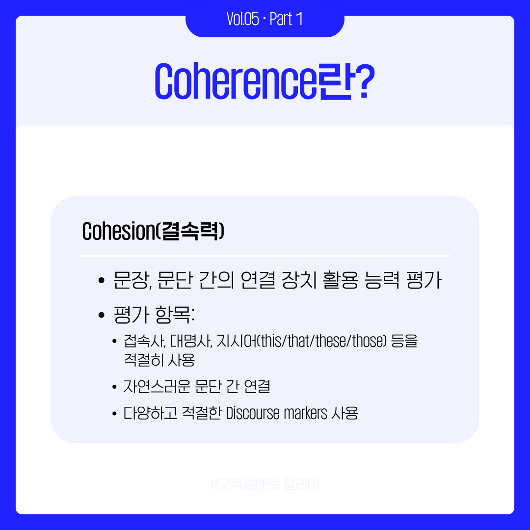 이번 카드뉴스에서는 Writing 평가 기준 중 두 번째 항목인 Coherence and Cohesion(이하 CC)을 분석했습니다. 'Coherence'는 논리적 흐름을, 'Cohesion'은 문장 간 연결을 의미합니다. 즉, 글이 얼마나 매끄럽게 이어지는지를 평가하는 항목이죠.
