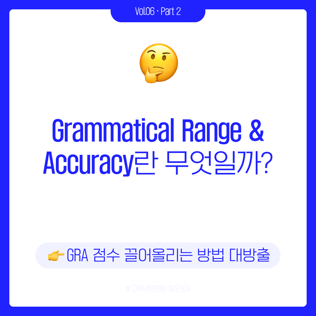 이번 편에서는 마지막 평가 기준인 Grammatical Range & Accuracy(GRA)를 다뤘습니다. GRA는 단순히 문법 오류를 줄이는 것을 넘어서, 다양한 문장 구조를 정확히 쓰는 능력을 평가합니다. 즉, 문법의 '다양성'과 '정확성'을 함께 봅니다.