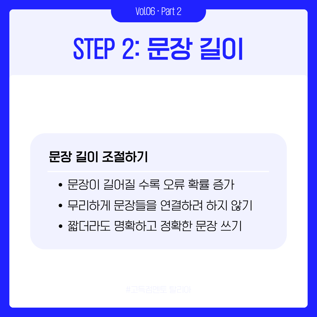 화려한 연결어보다 중요한 건 정확한 문장과 명료한 논리, 즉, 채점자가 쉽게 이해할 수 있는 글입니다. 문법이 탄탄하면 나의 의견을 그 뜻 그대로 전달할 수 있기에 글의 설득력까지 함께 상승합니다.