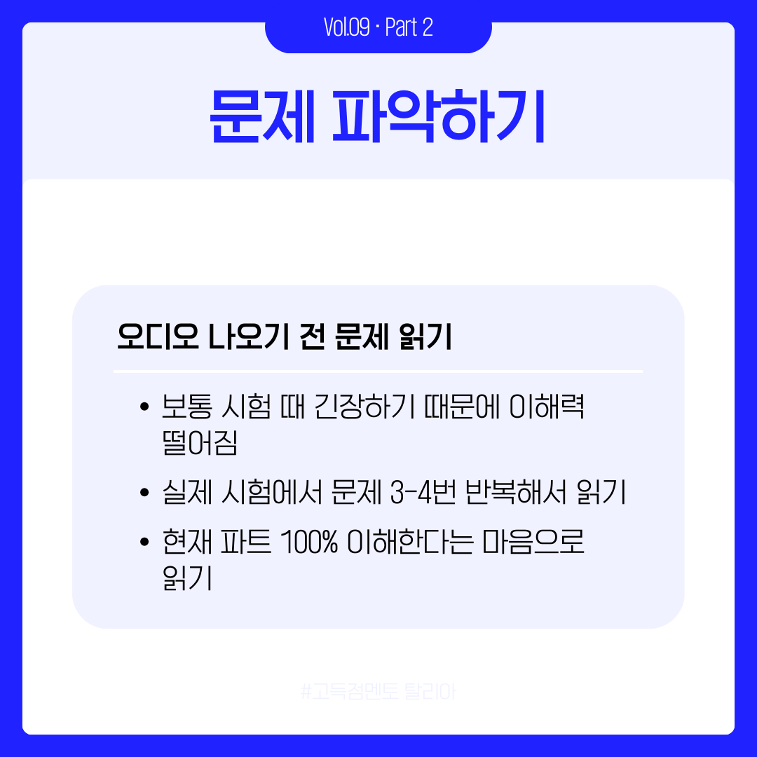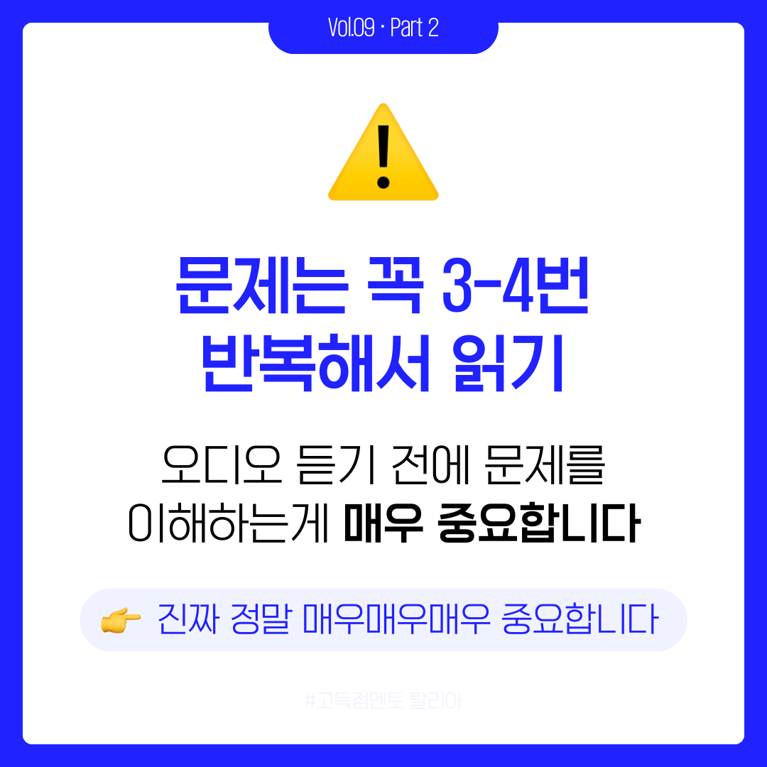 그래서 이번 카드뉴스 2편에서는 제가 실제로 점수를 만들면서 가장 중요하게 느꼈던 시험형 스킬을 선별해 담았습니다. 객관식 문제를 읽는 법, 객관식 문제에서 소거법을 실전처럼 사용하는 방법, 단어 채우기 문제에서 스펠링·단복수 실수를 줄이는 법, 그리고 많은 분들이 힘들어하는 "놓쳤을 때 멘탈이 흔들리는 문제"를 어떻게 해결했는지까지 모두 정리했습니다. Listening은 전부 들어야 하는 시험이 아닙니다. 한 문제를 놓쳤더라도 다음 문제는 놓치지 않는 것, 그게 고득점을 만드는 핵심입니다.