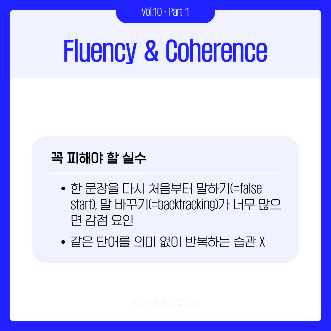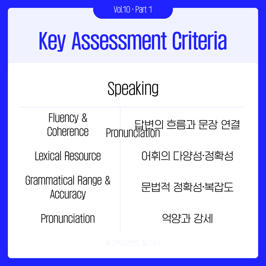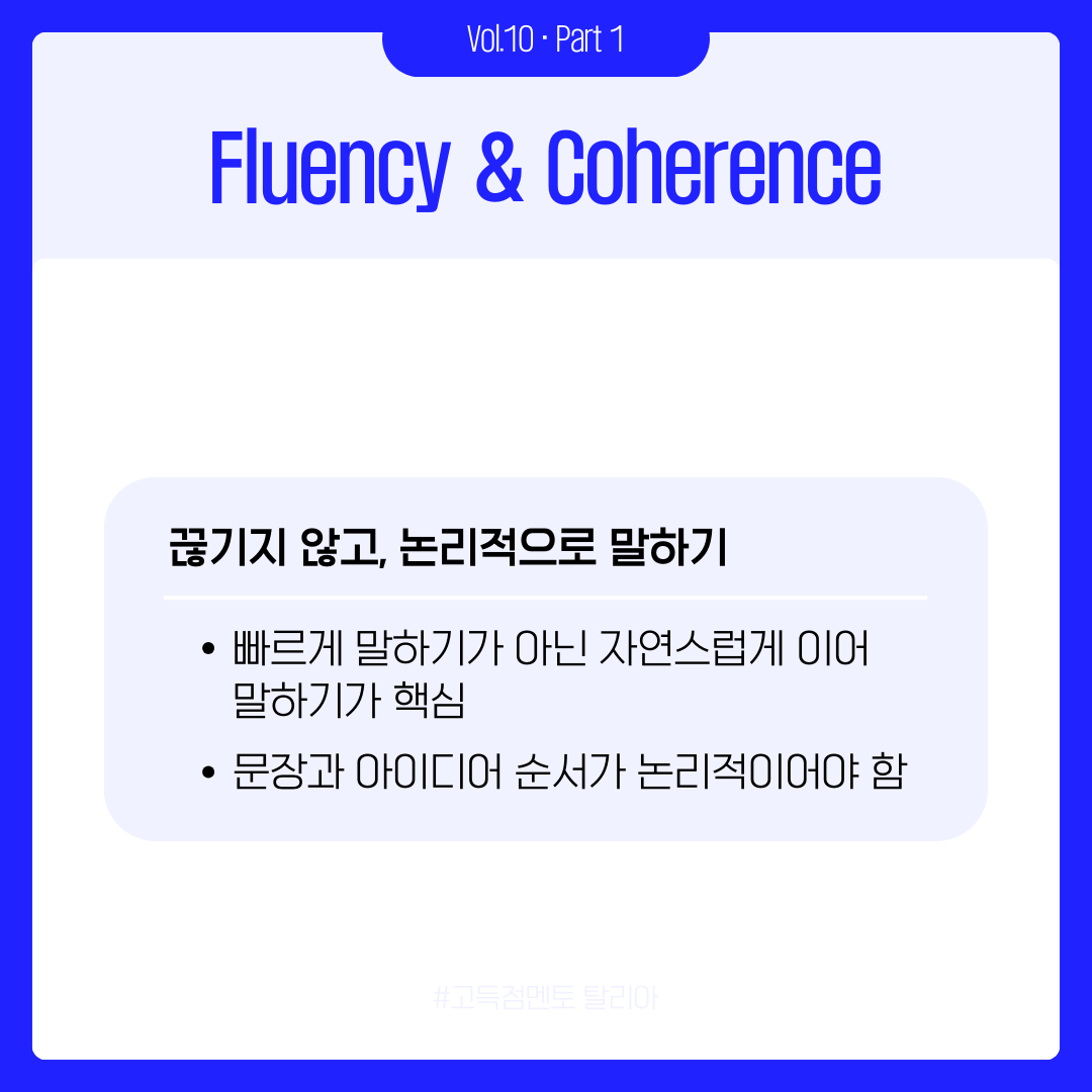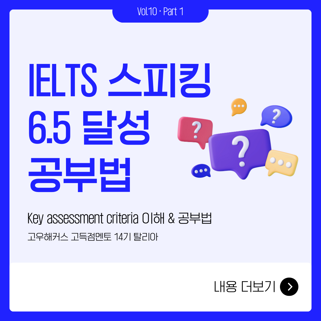 그래서 이번 카드뉴스 1편에서는 스피킹에서 가장 기초적이면서도 중요한 부분, 바로 채점 기준에 집중했습니다. Fluency & Coherence, Lexical Resource, Grammar, Pronunciation이 각각 무엇을 의미하며, 시험관이 실제로 무엇을 평가하는지를 아주 구체적으로 풀어봤습니다. 그리고 이 기준을 바탕으로 말을 구조화하는 기술, 즉 서론–본론–결론 구조를 어떻게 말하기 형태로 옮기면 되는지도 담았습니다.