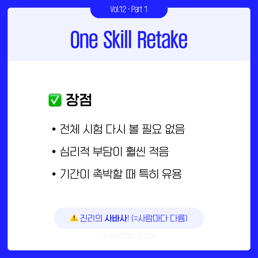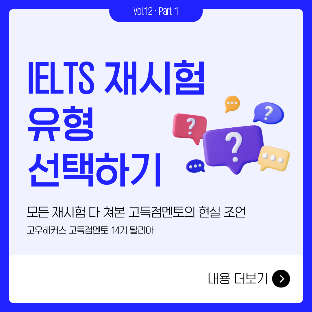 IELTS를 준비하다 보면 이런 순간이 옵니다. "전체 점수는 괜찮은데… 딱 한 과목이 문제네." 저 역시 그랬습니다. 한 과목이 계속 목표 점수에 미치지 못해 시험을 여러 번 치렀고, 그 과정에서 전체 재시험, 재채점(EOR), One Skill Retake까지 모두 직접 경험해 보았습니다. 하지만 막상 점수가 아쉬울 때는 어떤 선택이 가장 합리적인지 판단하기가 쉽지 않더라고요. 이번 카드뉴스 1편에서는 세 가지 선택지를 객관적으로 정리해 보았습니다. 각각의 제도가 어떤 상황에서 유리한지, 장점과 한계는 무엇인지 제 경험을 바탕으로 풀어냈습니다. '무조건 다시 쳐라'가 아니라, 내 상황에 맞는 선택을 고민 중인 분들께 참고 자료가 되었으면 합니다. (개인적인 경험이니 100% 맹신은 금물!)