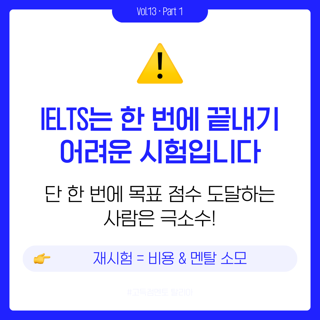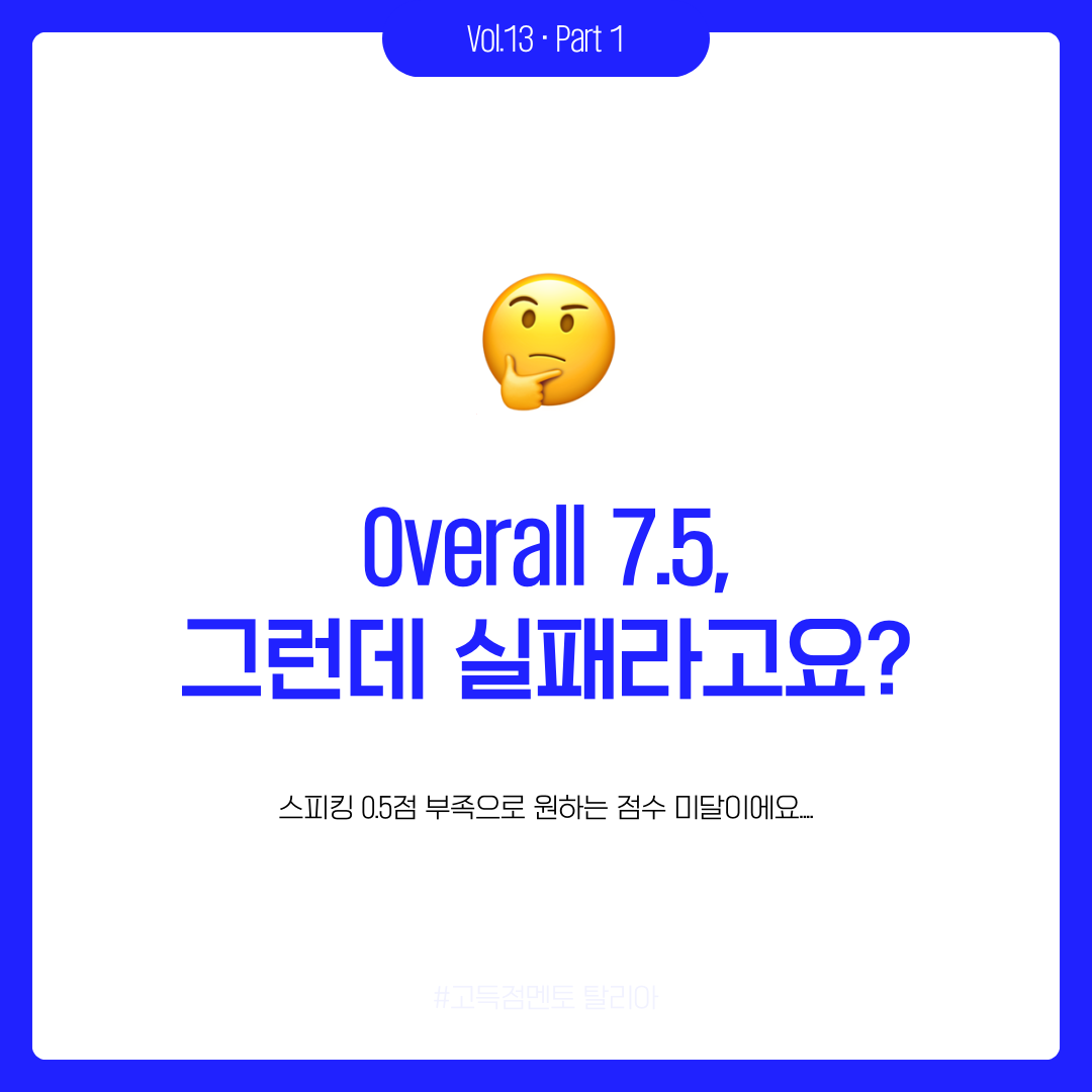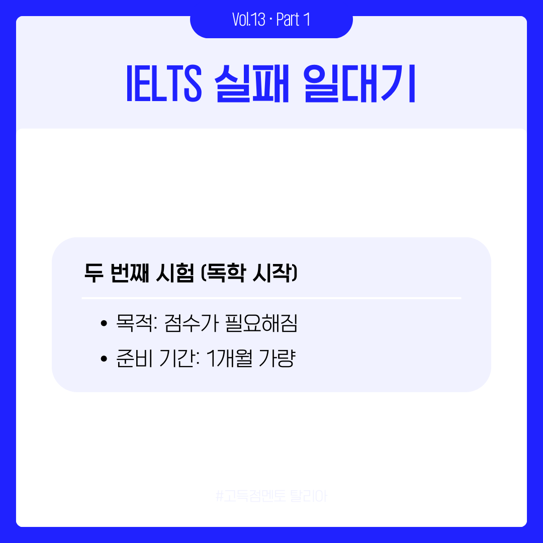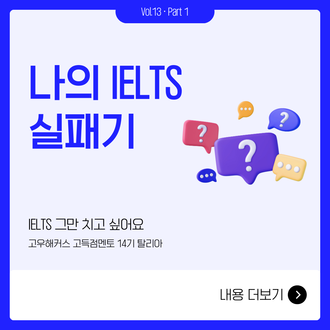 고득점멘토에 overall 7.5라고 하면, "이 점수가 어떻게 실패인가?"라고 생각하실 수도 있을 것 같습니다. 제가 제목을 "나의 IELTS 실패기"라고 적은 이유는 결국 목표 점수를 달성하는 것에 실패했기 때문입니다. 다른 영역은 모두 목표 점수를 충족했지만, 스피킹에서 단 0.5점이 부족해 시험을 반복하게 되었고, 결국 원하는 결과에는 도달하지 못했습니다. 이번 카드뉴스 1편에서는 저의 첫 IELTS 시험부터 독학을 결심하게 된 과정, 각 시험 때의 상황, 그리고 IELTS가 왜 한 번에 원하는 점수를 달성하기 어려운 시험인지 제 경험을 기반 삼아 솔직하게 풀어보았습니다. 시험 앞에서는 누구나 흔들릴 수밖에 없습니다. 이 글이 점수가 잘 나오지 않는 이유를 스스로의 부족함으로만 돌리고 계신 분들께, 작은 위로가 되었으면 합니다.