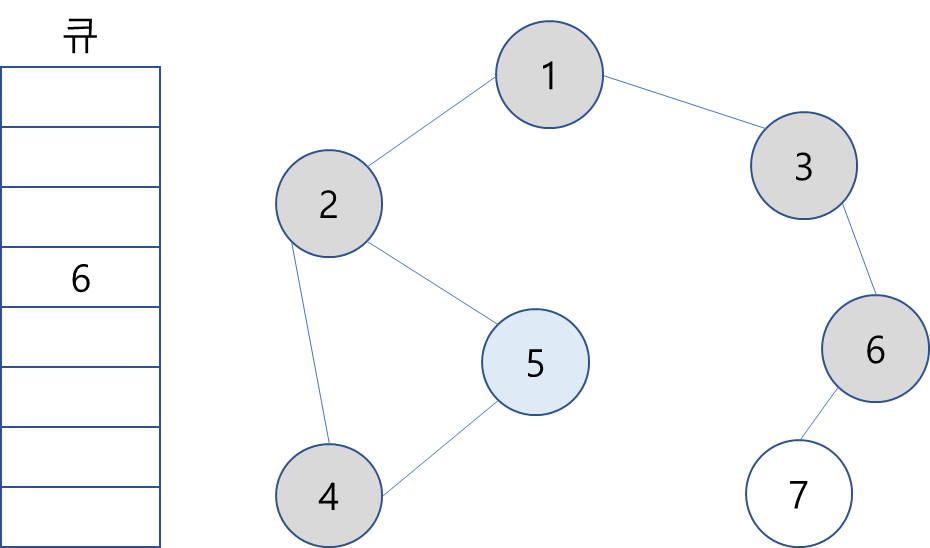 6. 큐에서 5를 꺼내고 방문하지 않은 인접 노드가 없으므로 무시.