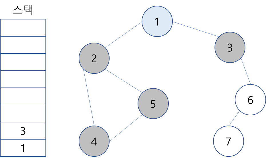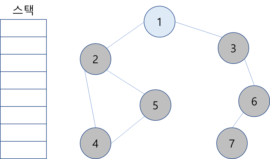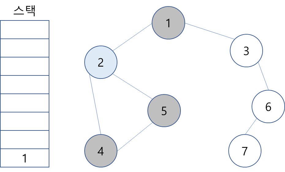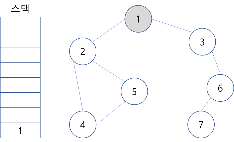 1. 시작 노드인 1을 스택에 삽입하고 방문 처리한다.