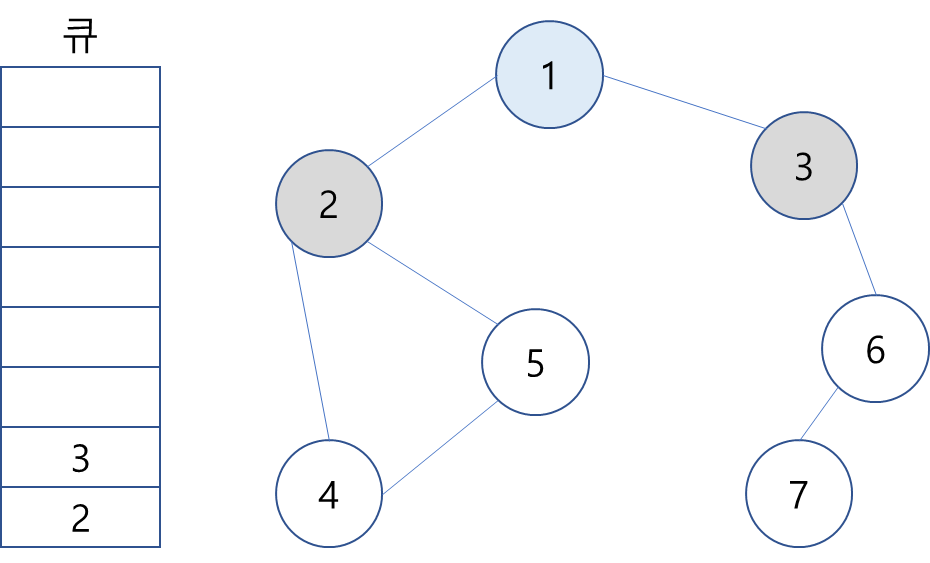 2. 1을 큐에서 꺼내고, 꺼낸 노드의 인접 노드 2와 3을 큐에 삽입하고 방문 처리.