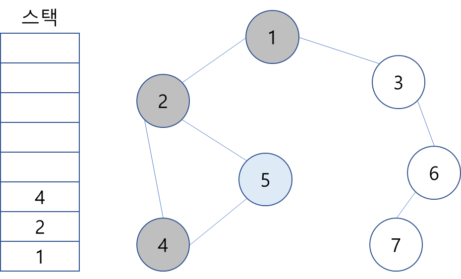 5. 스택 최상단 노드인 5에게는 방문하지 않은 인접 노드가 없기에 없기에 5를 스택에서 제거.