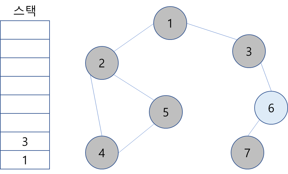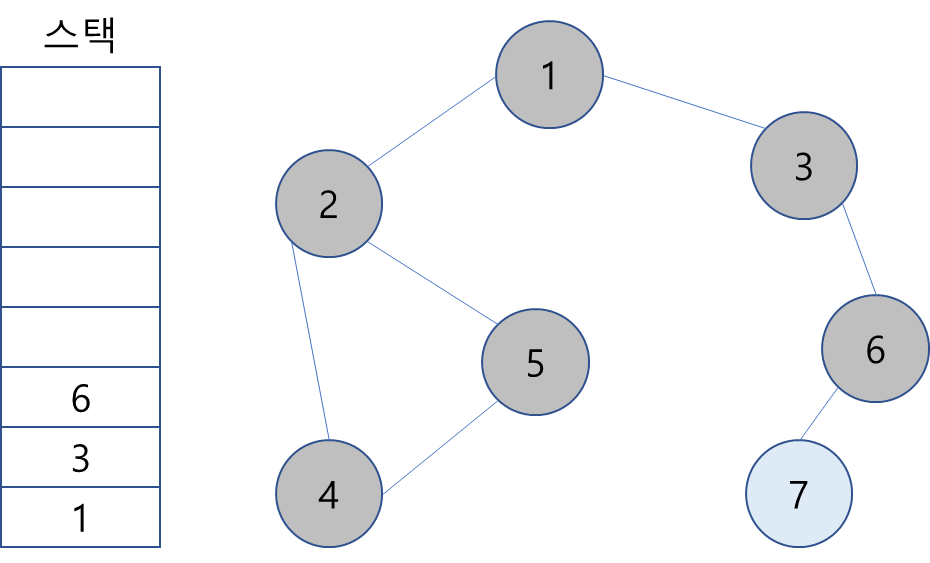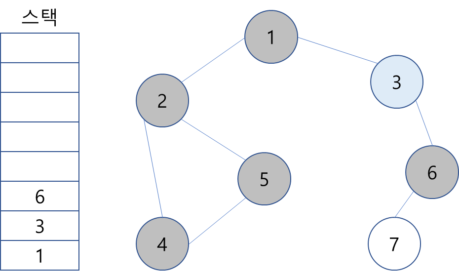 2. 스택의 최상단 노드에 방문하지 않은 인접 노드가 있다면 그 노드를 스택에 넣고 방문 처리. 만약 방문하지 않은 인접 노드가 없으면 스택에서 최상단 노드를 꺼냄.