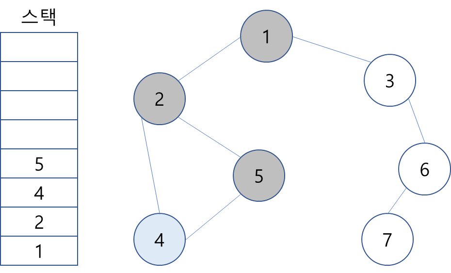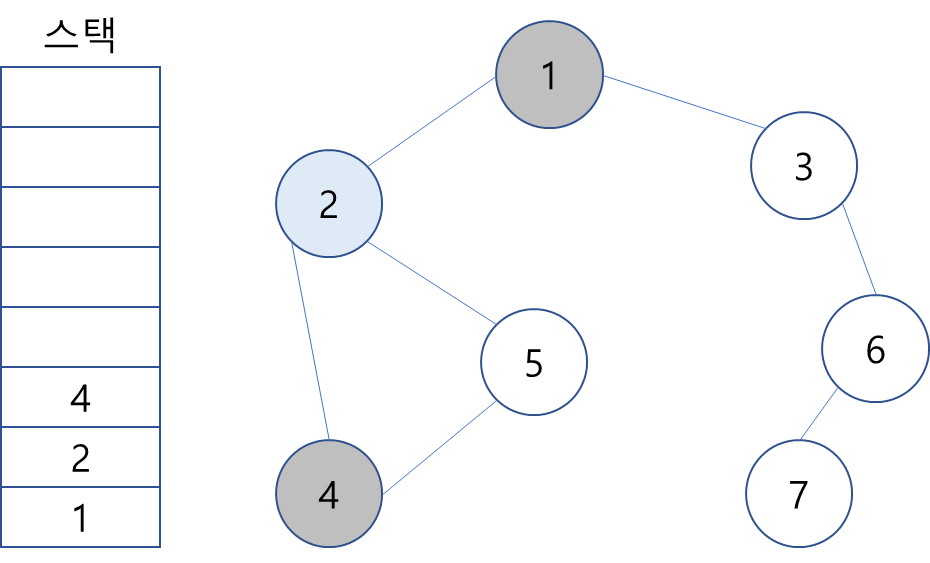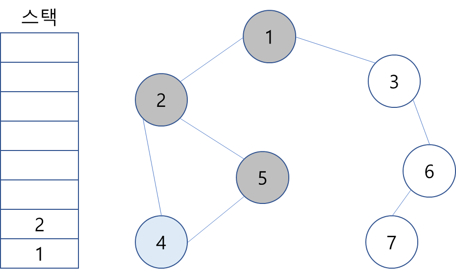 3. 스택의 최상단 노드인 2에 방문하지 않은 인접 노드 4와 5 중 가장 작은 4를 스택에 넣고 방문 처리.