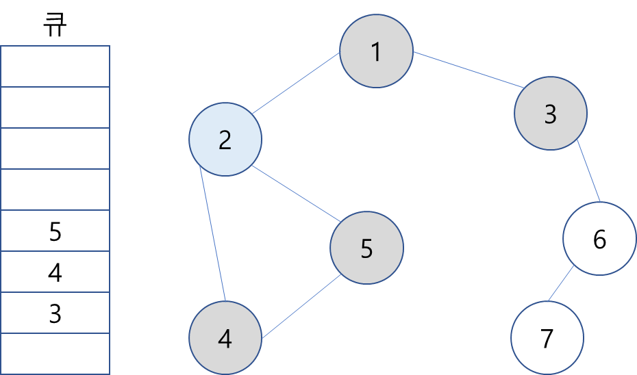 3. 큐에서 2를 꺼내고 방문하지 않은 인접 노드 4와 5를 큐에 삽입하고 방문 처리.