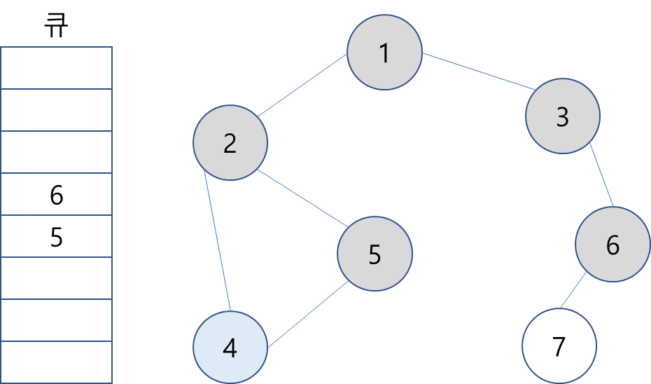 5. 큐에서 4를 꺼내고, 방문하지 않은 인접 노드가 없으므로 무시.