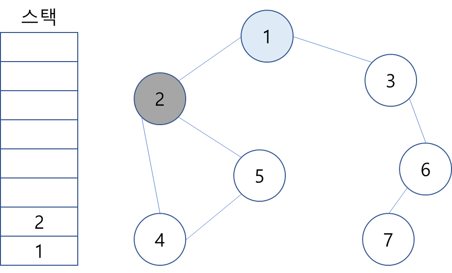 2. 스택 최상단 노드인 1에게는 인접하지만 방문하지 않은 노드 2와 3이 있다. 이 중에 가장 작은 노드인 2를 스택에 넣고 방문 처리. (일반적으로 인접한 노드 중에서 방문하지 않은 노드가 여러 개 있다면 번호가 낮은 순부터 처리한다.)