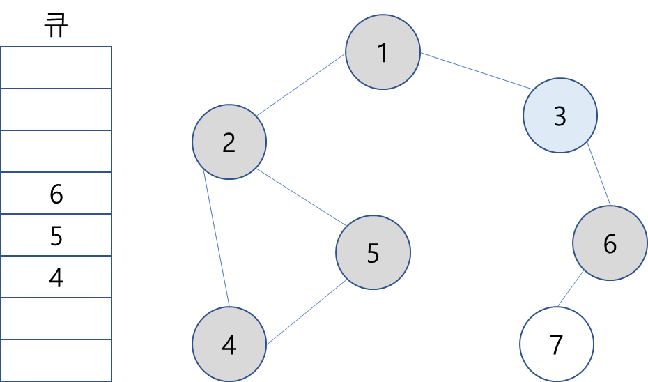 4. 큐에서 3을 꺼내고 방문하지 않은 인접 노드 6을 큐에 삽입하고 방문 처리.