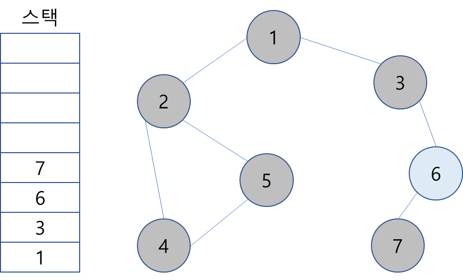 10. 스택 최상단 노드인 6의 방문하지 않은 인접 노드 7을 스택에 넣고 방문 처리.