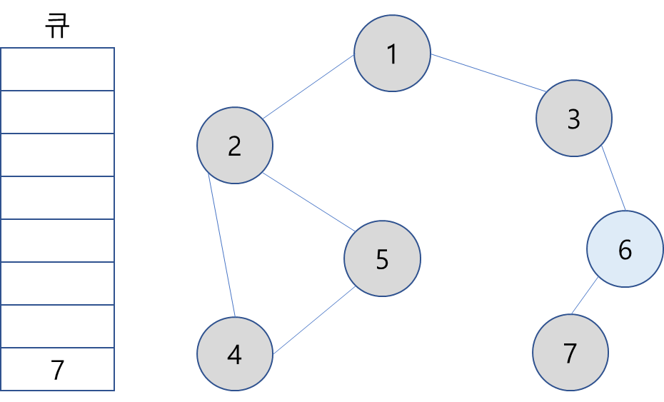 7. 큐에서 6을 꺼내고 방문하지 않은 인접 노드 7을 큐에 삽입하고 방문 처리.