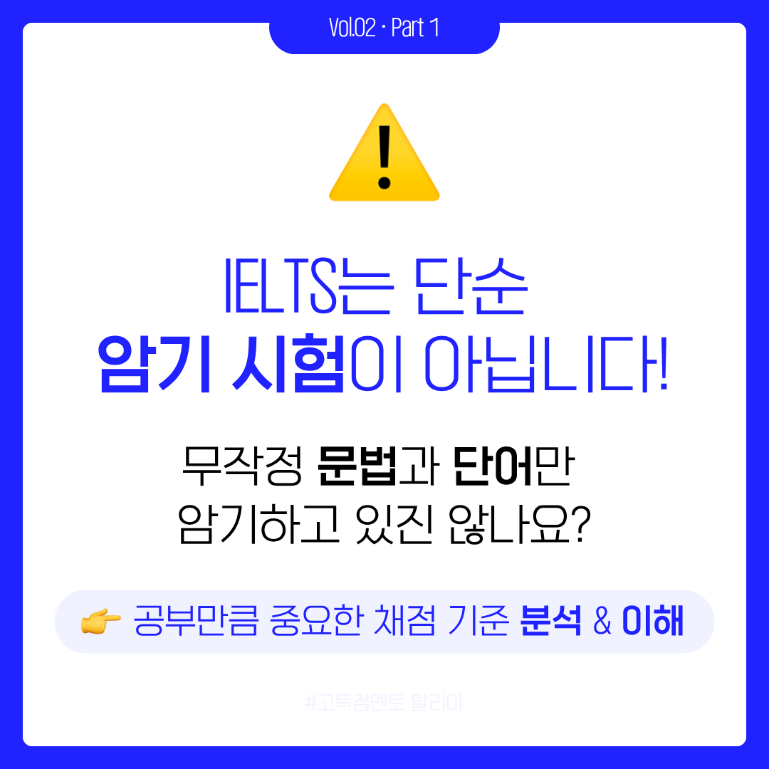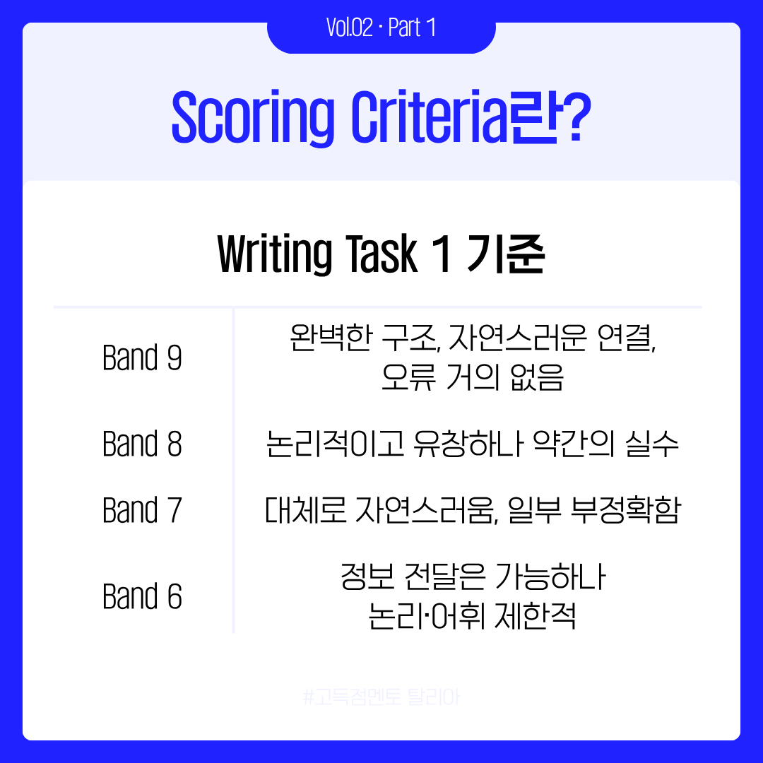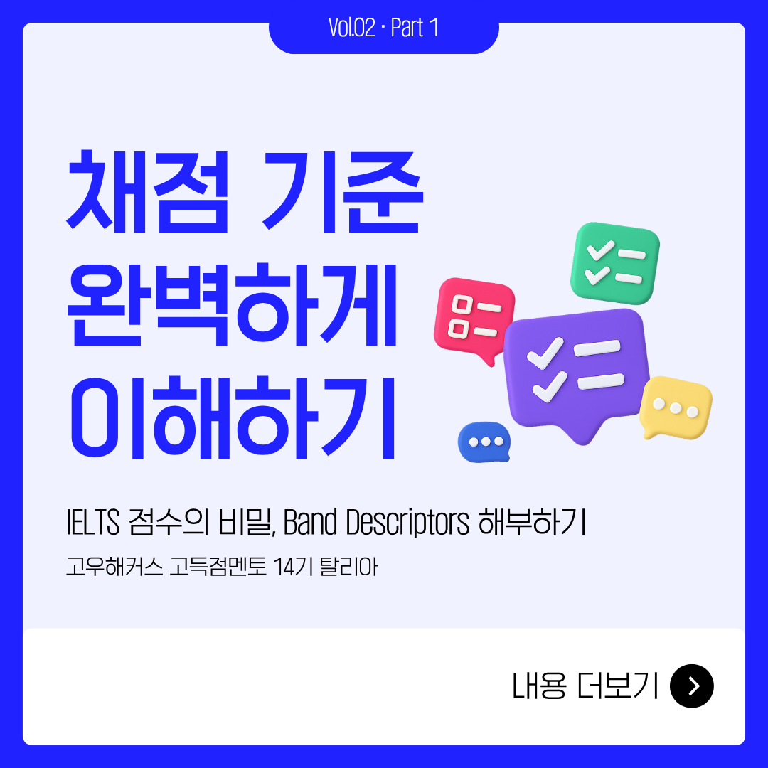 IELTS 공부를 하다 보면, “왜 내 글은 6.5일까?”라는 생각 한 번쯤 하게 되죠. 열심히 썼는데도 점수가 오르지 않는 이유, 사실 ‘채점 기준’을 잘 모르기 때문일 수도 있습니다. 이번 카드뉴스에서는 IELTS Writing의 Band Descriptor, 즉 채점자가 글을 평가할 때 참고하는 기준을 쉽고 간단하게 정리해 보았습니다.