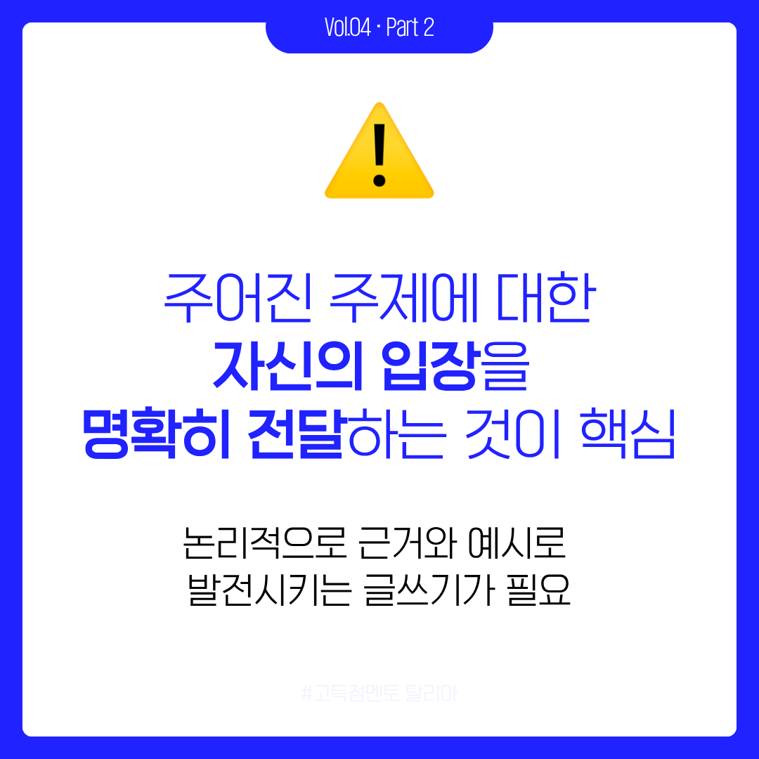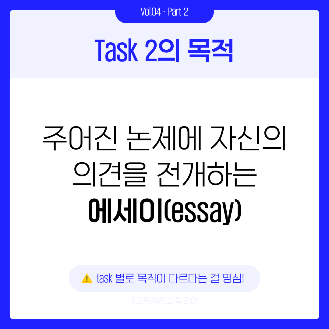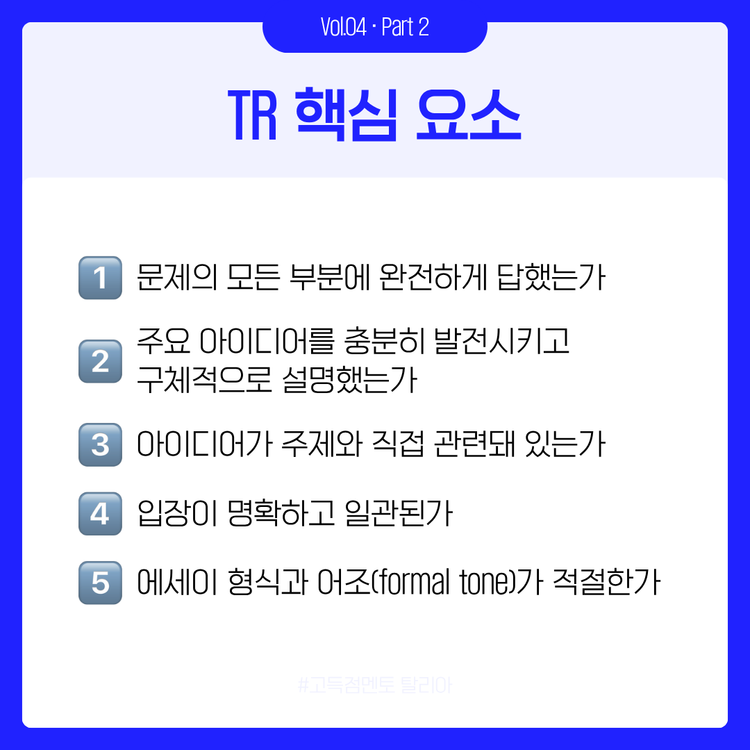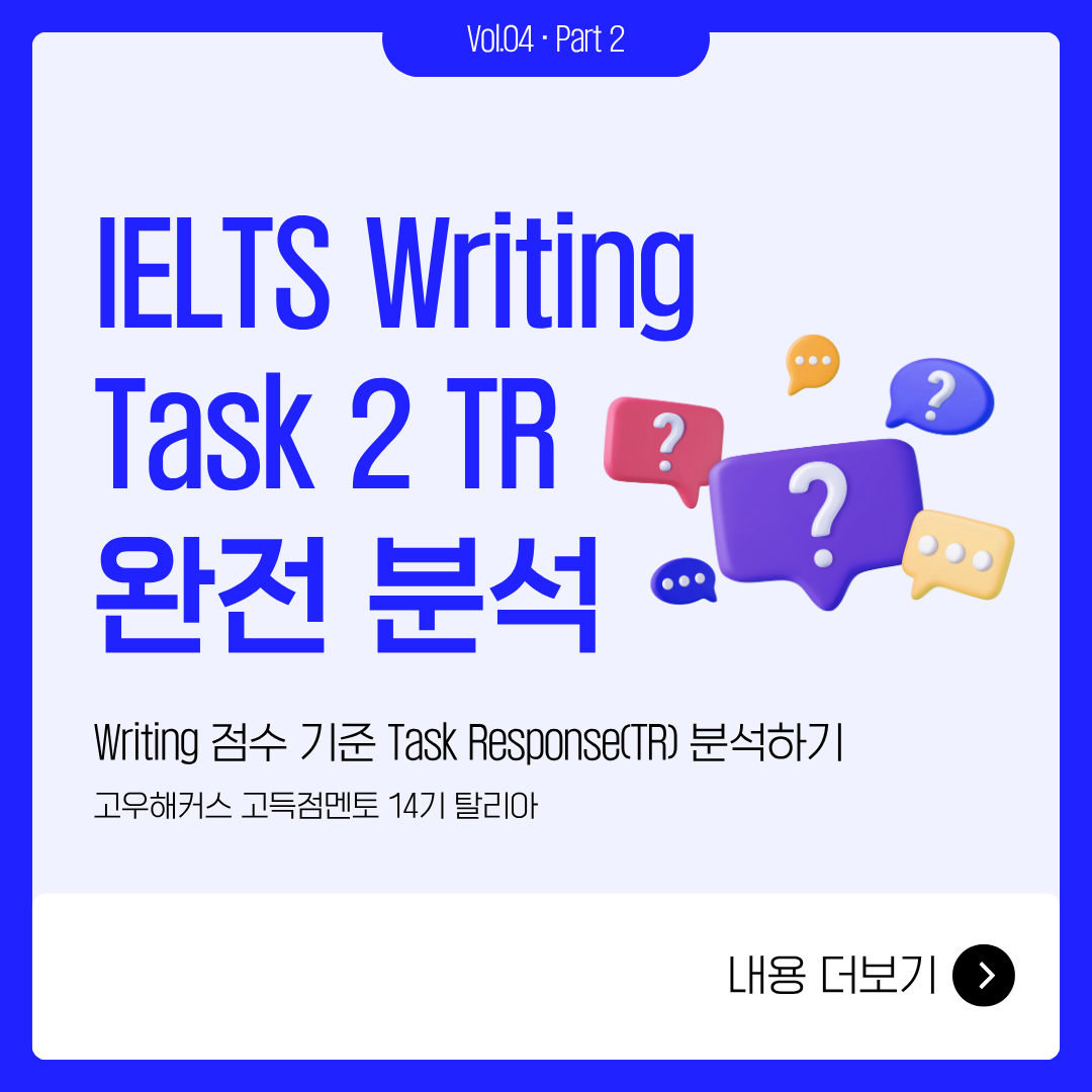 Writing Task 2에도 Task 1과 마찬가지로, 점수를 결정짓는 건 화려한 문장이 아닙니다. 주제에 얼마나 충실하게, 논리적으로 답했는가, 바로 Task Response(이하 TR)가 핵심이죠. 이번 카드뉴스에서는 TR이 평가하는 다섯 가지 요소를 제 경험을 바탕으로 정리했습니다 — 문제의 모든 부분에 답했는가, 아이디어가 충분히 발전됐는가, 주제에 직접적인 관련이 있는가, 입장이 일관된가, 그리고 형식이 적절한가.